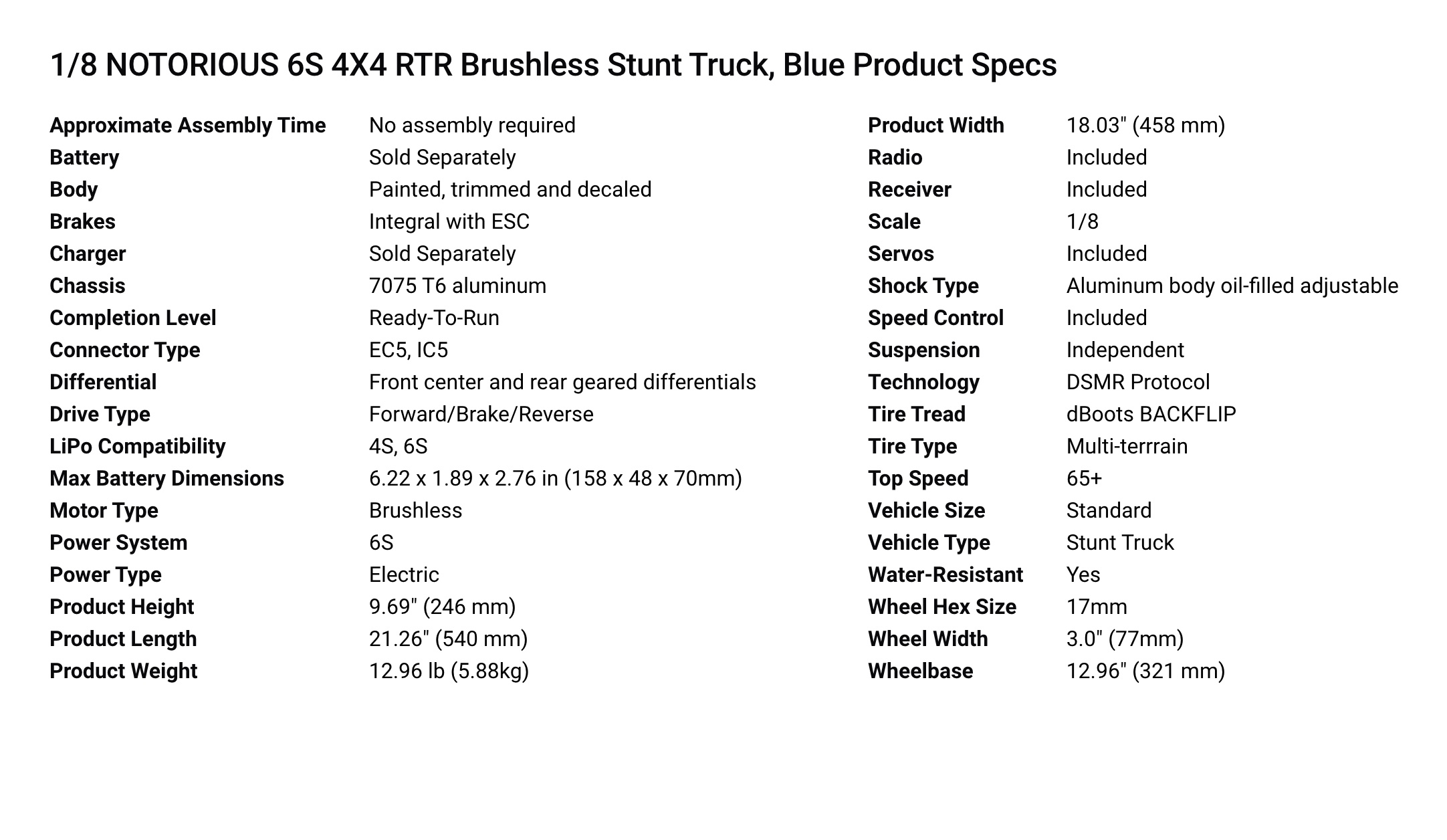 This next evolution of the ready-to-run, 1/8 scale NOTORIOUS 6S BLX 4X4 stunt truck has more punch and durability for even wilder stunts. Not sure you’re ready for extreme 6S power? It’s plenty fun and manageable on 4S - and ready to advance when you are.