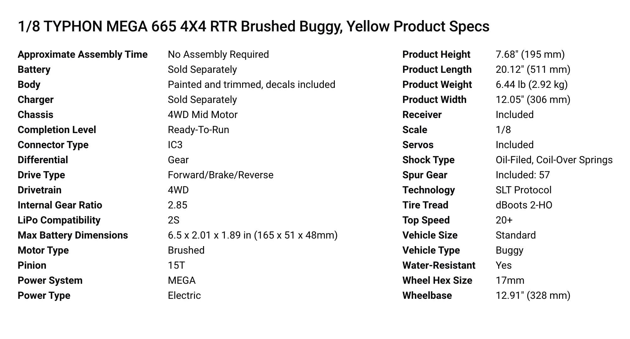 Move up to next-level buggy bashing with the 1/8 scale ARRMA TYPHON MEGA 665 4x4. Updated with an oversize 665 motor, 3S brushless-ready transmission, and even tougher design, it’s a bigger, better RTR basher that grows right along with your skills.