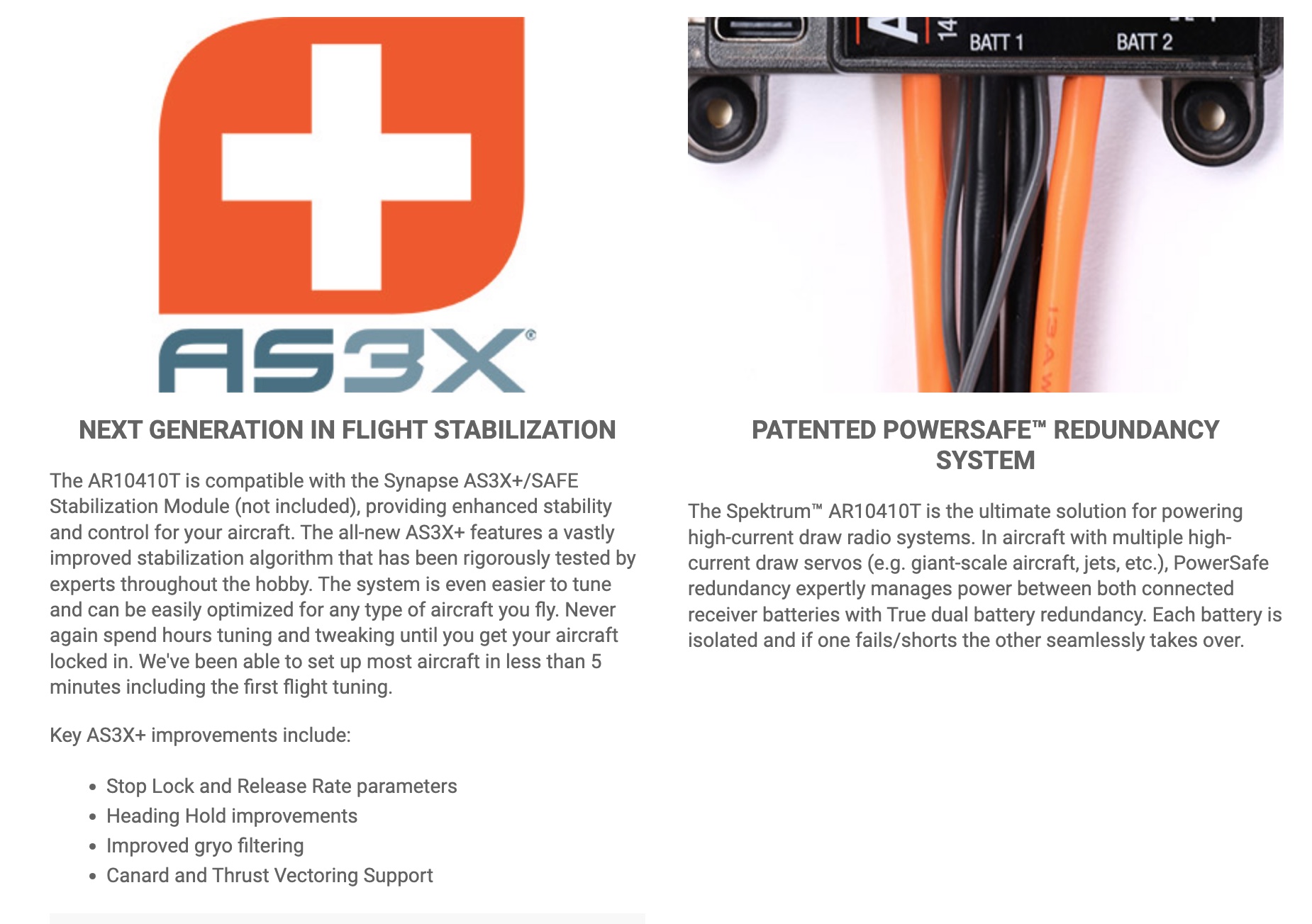 The AR10410T is a 10-channel receiver with full-range telemetry that uses the Spektrum™ PowerSafe™ redundant battery system. It features connections for full telemetry support including RPM, Flight Pack Voltage and Temperature, and X-Bus. The receiver also has a built-in vario/altitude sensor and mAh sensors that allow tracking of consumed mAh. It can be powered through the servo bus or dual IC3™ connections. It is compatible with the Spektrum Synapse™ AS3X+ / SAFE (SPMAS6000) stabilization module, delivering instantaneous attitude corrections and enhancing flight stability.
