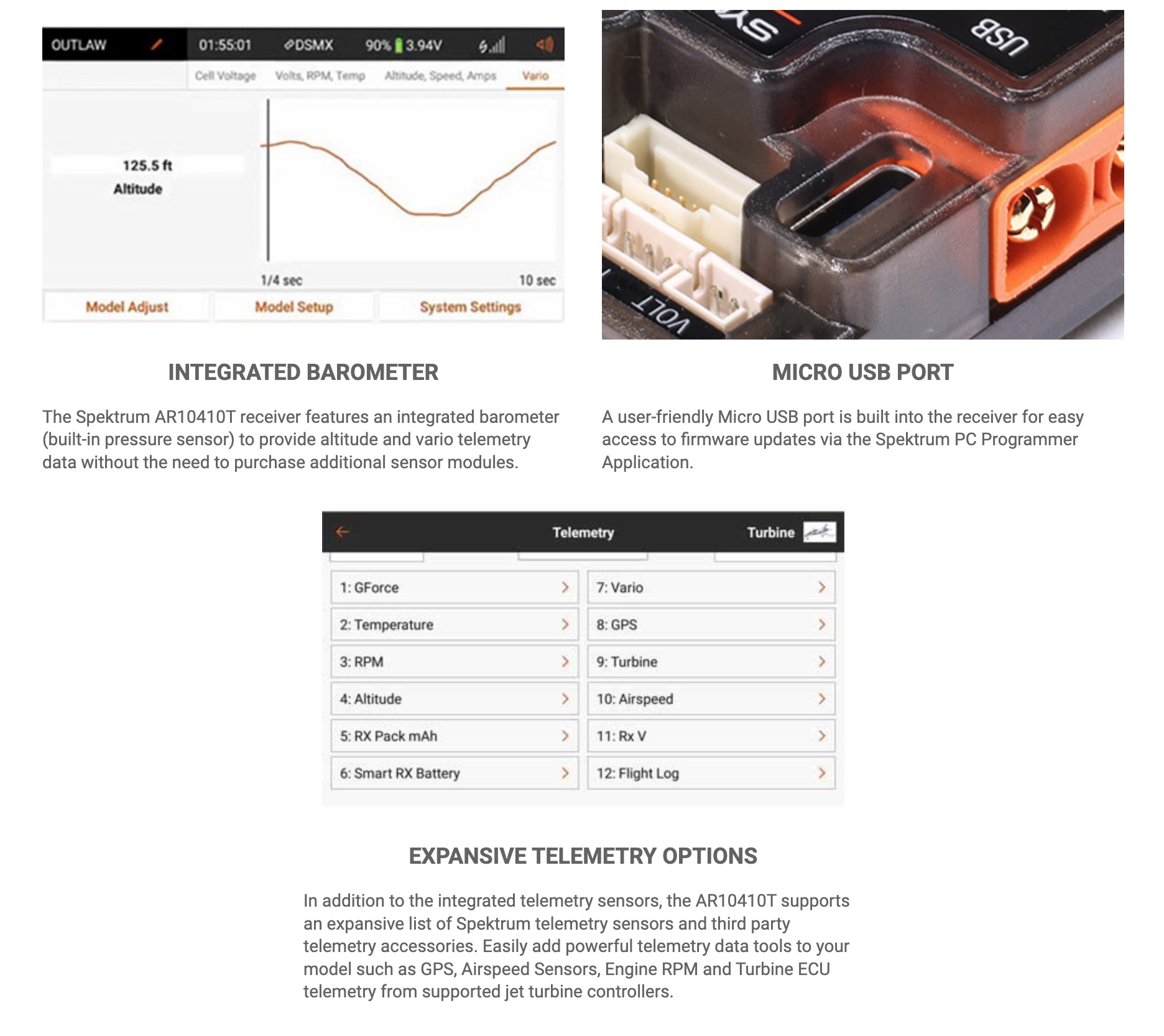 Using an optional micro-SD card, the AR10410T can store flight data for later review as a CSV file. It also has a new, push-button PowerSafe LED soft switch or can be powered on and off through the on-board button. Additionally, the system can be put in sleep mode from a compatible Spektrum transmitter and woken up between flights and can be powered off from your compatible Spektrum transmitter as well. Bind can be initiated through the button or a bind plug. The AR10410T can be updated easily through the USB-C connection.