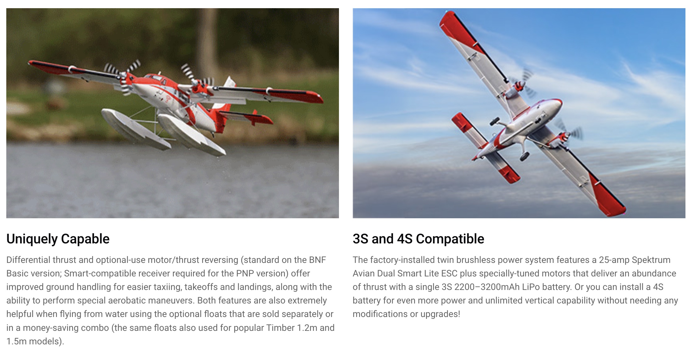 Rugged STOL performance: twin brushless motors, twin 25A Spektrum Avian Smart Lite ESC, and compatibility with both 3S and 4S LiPo batteries mean thrilling takeoff and climb from grass, dirt, or water