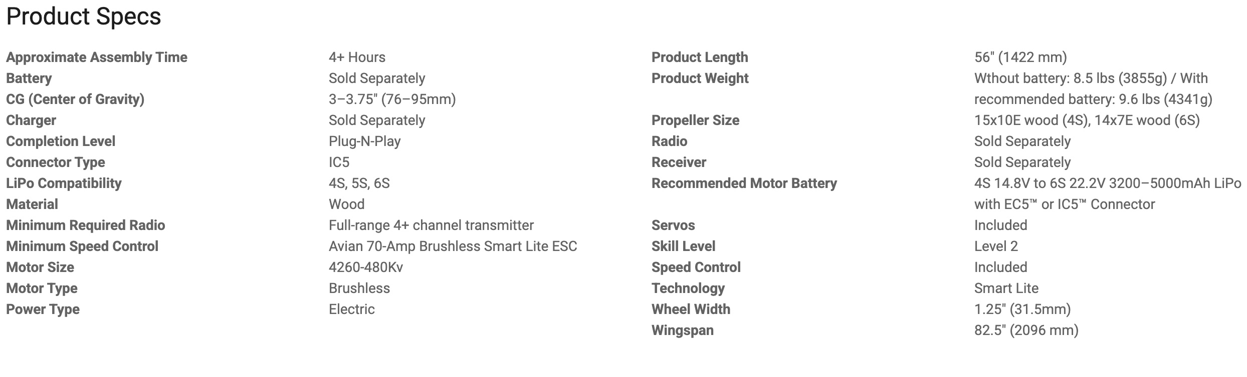 The Hangar 9® J-3 Cub 10cc is an 82.5” (2.1m) span giant-scale replica of the aviation icon. It's designed to deliver the original's classic look and flying experience with modern-day features and conveniences, including a 2-piece wing and slots to hold the wing tube in the fuselage during storage and transport. The ARF version arrives mostly factory assembled and allows you to install a .62 4-stroke glow, 11cc 4-stroke gas, and other similar class engines or an equivalent electric power system and the electronics you prefer. The PNP version doesn't require any glue for assembly. It is equipped with four factory-installed digital and metal-geared Spektrum A6380 servos, a 4S to 6S compatible Avian 4260-480Kv outrunner motor, and a 70-amp Smart Lite ESC that can provide a variety of power system-related telemetry data with Smart and non-Smart batteries via compatible receivers and Spektrum AirWare equipped transmitters.
