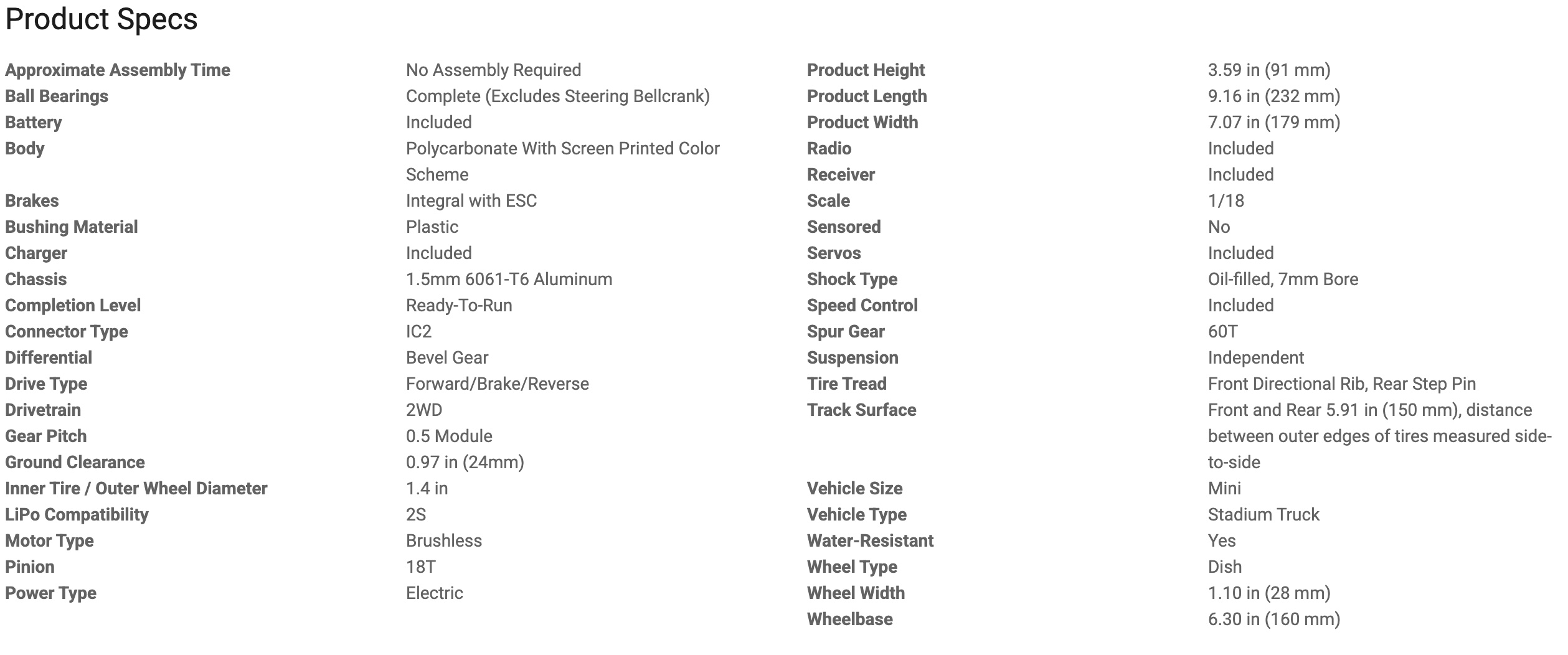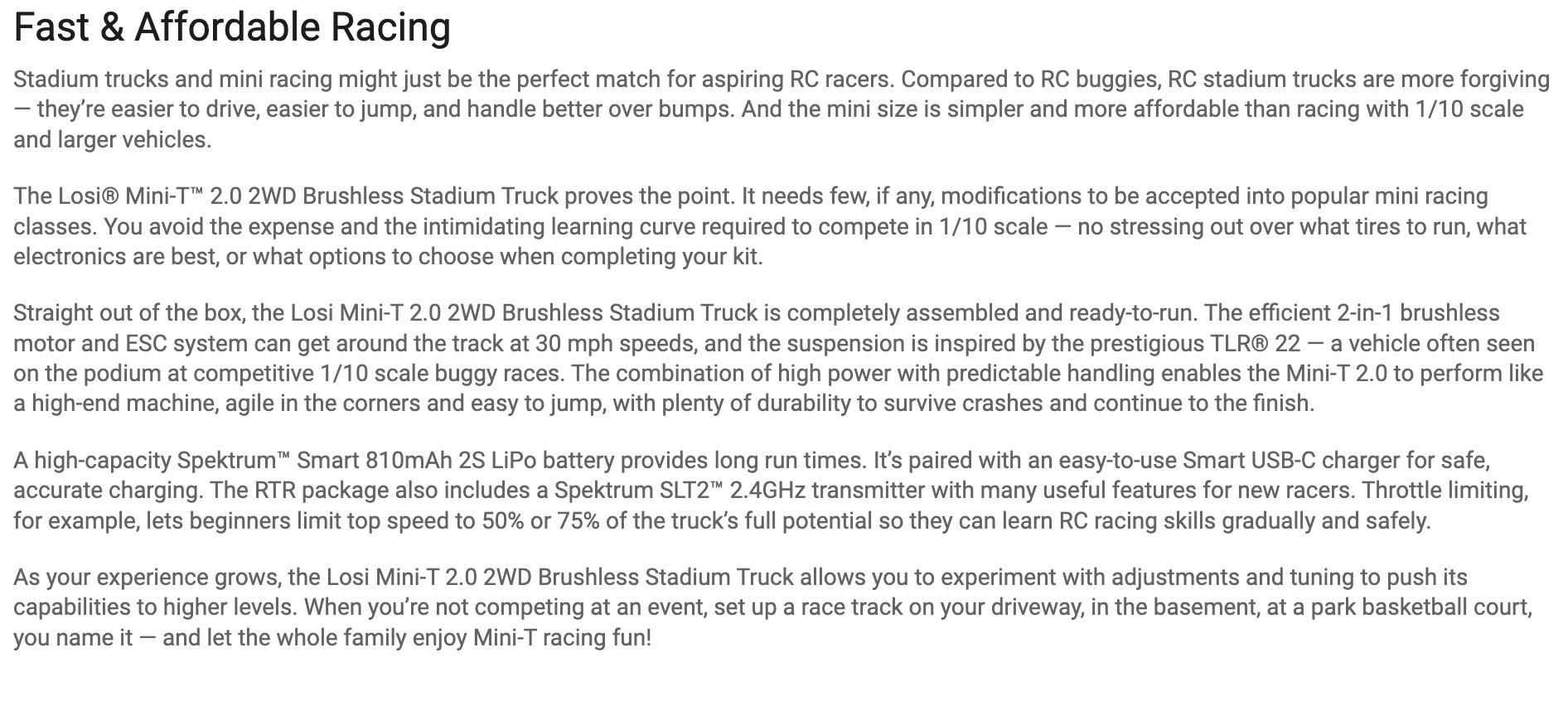 Feed your inner racer with the affordable, ready-to-run Losi® Mini-T™ 2.0 2WD Brushless Stadium Truck. With the included Spektrum™ brushless electronics and a TLR® race-inspired design, it has the speed, handling, and tuning potential to put you in the lead.