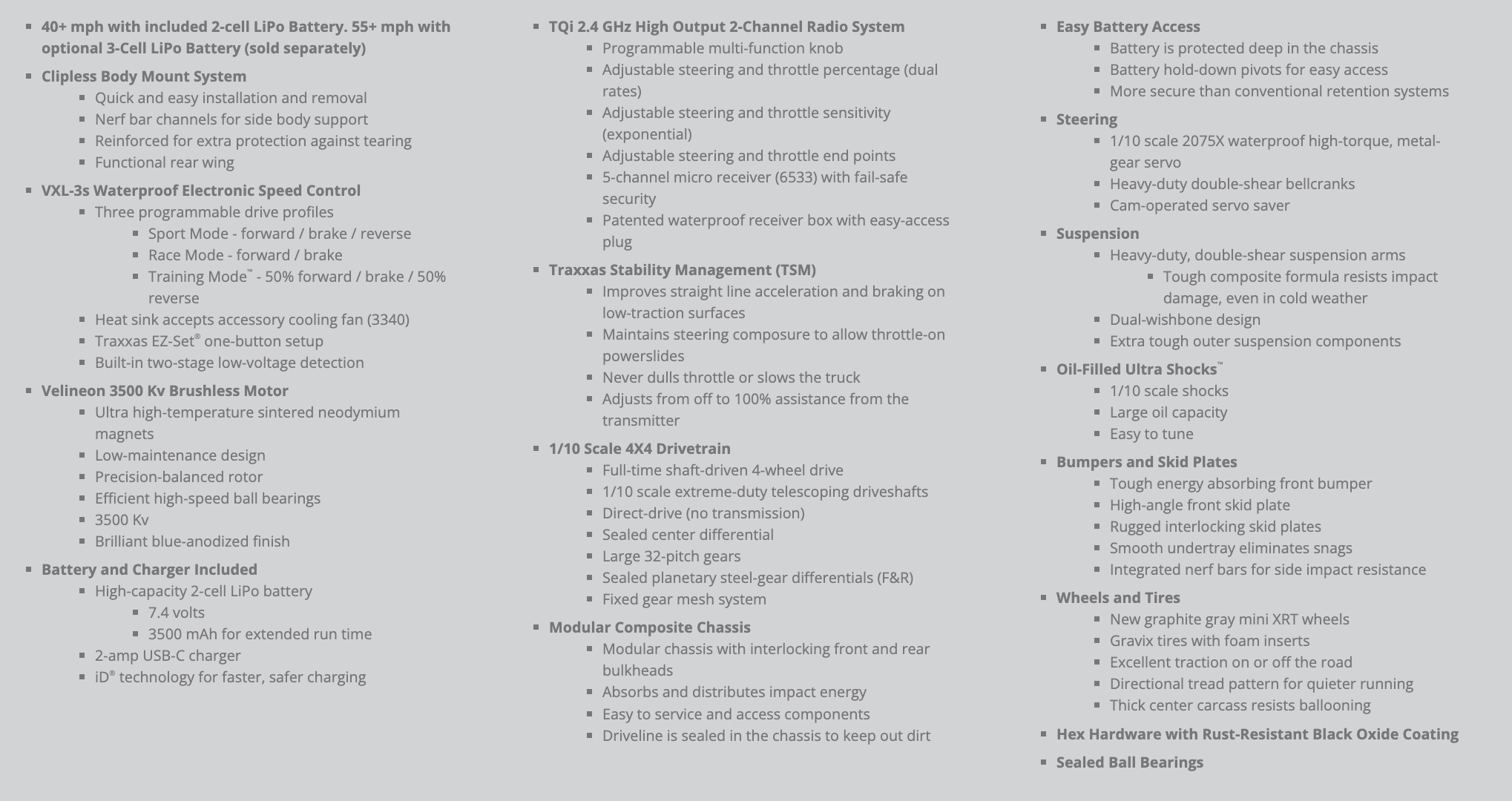 55+ mph with 3s LiPo battery (upgrade option, 3s LiPo TRA2824X not included)