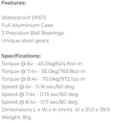 The powerful "Monster" performance series from Savox utilize an all aluminum case, unique brushless motor and controller technology to boost power up to 35% over previous generation servos.